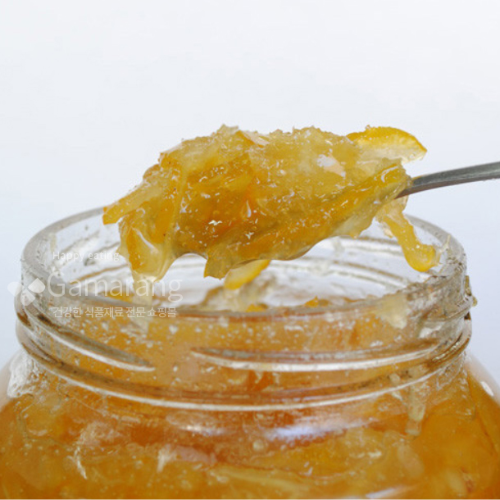 노란 유자 마멀레이드: 얇게 썬 유자 껍질을 활용하여 젤리처럼 쫀득한 식감의 마멀레이드를 만듭니다.